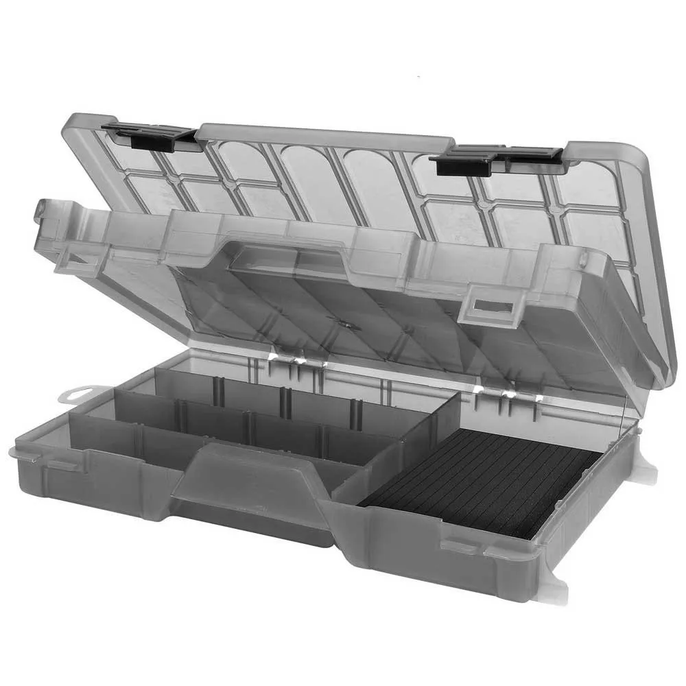 Double sided lure boxes designed for storing hard lures and soft lures. One side features a built in EVA board for storing jig heads or rigged soft lures!