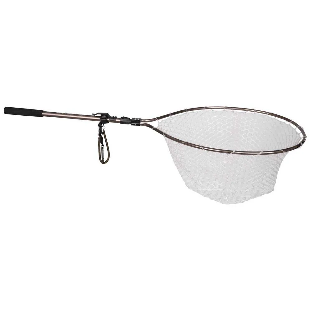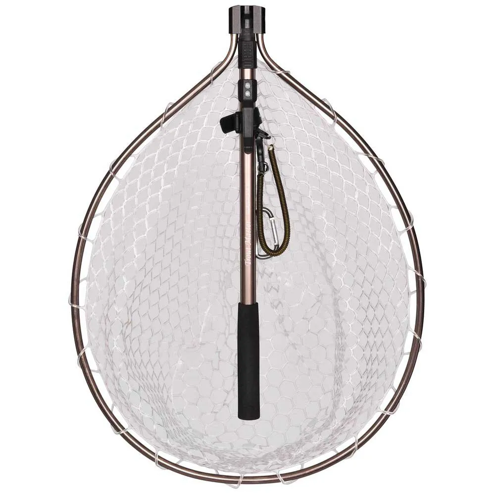 The River Rubber Flick Net is designed for trout anglers who activley target trout in a wild environent. The net utilizes our robust and simple to use one handed flick net mechansim. The River Flick Net includes a coil carabiner to secure to your belt or bag while in use. The coil carabiner can be clipped together when not in use. The clear rubber mesh used is hook resistant, quick drying and very easy to clean. The complete net is floating.