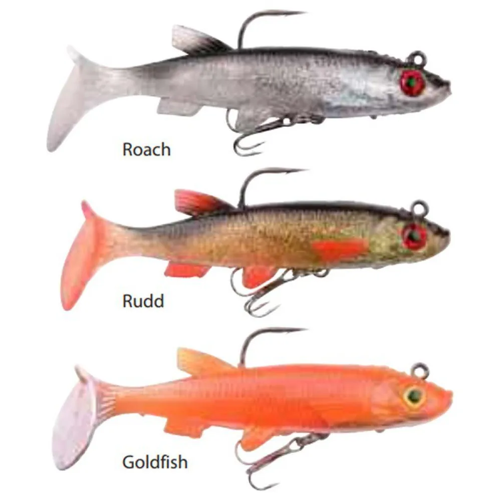 A pre-rigged natural perch imitation. Rigged with one large single hook and one treble hook.