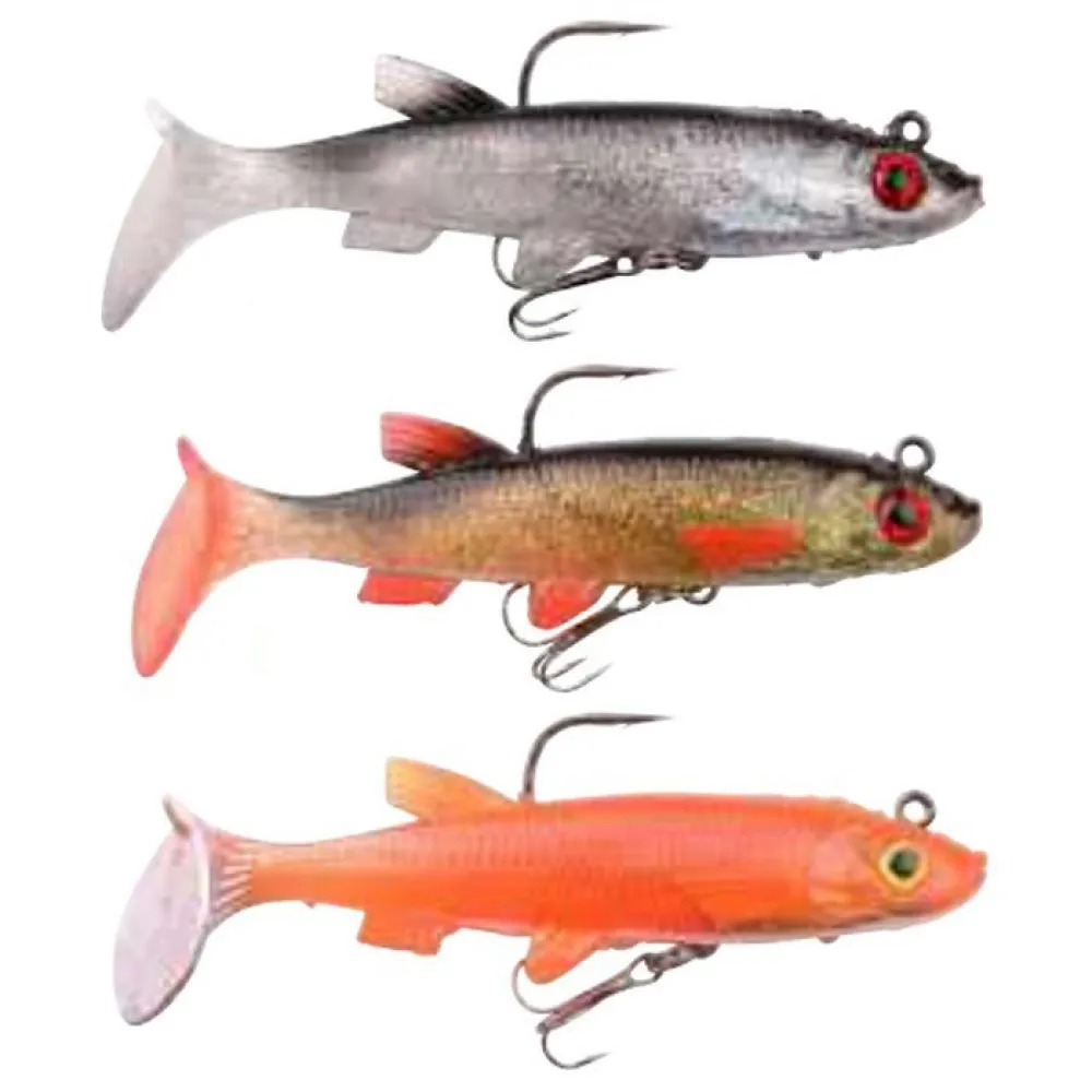 A pre-rigged natural perch imitation. Rigged with one large single hook and one treble hook.