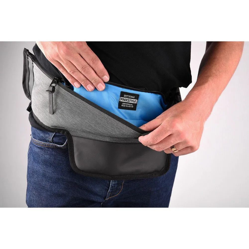 A universal rod protection sleeve for use with two section rods from 1,80 – 2,4m in length. When used with shorter rods the sleeve tip can be folded over and secured to create a tight fit on your rod. The sleeve also doubles up as a fishing belt with front pocket for storing a reload riggd box on the go.